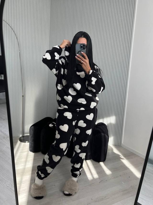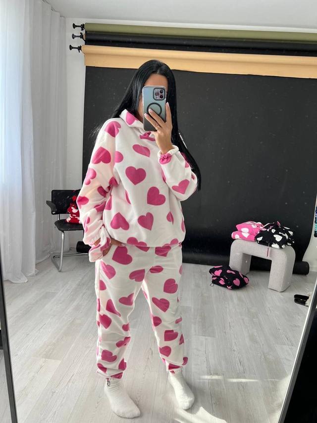 | Тип призначення | Тепла жіноча піжама сердечка двосторонній фліс кофта худі та штани + гумка на подарунок домашній комплект |