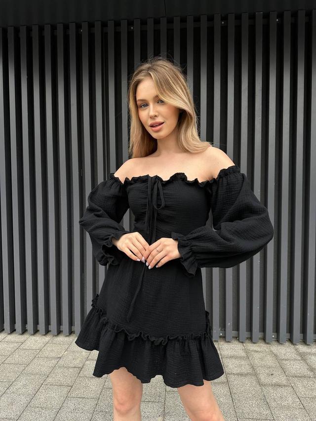 Сукня має короткий крій, який підкреслює жіночність та оголює ноги, створюючи грайливий та легкий образ.