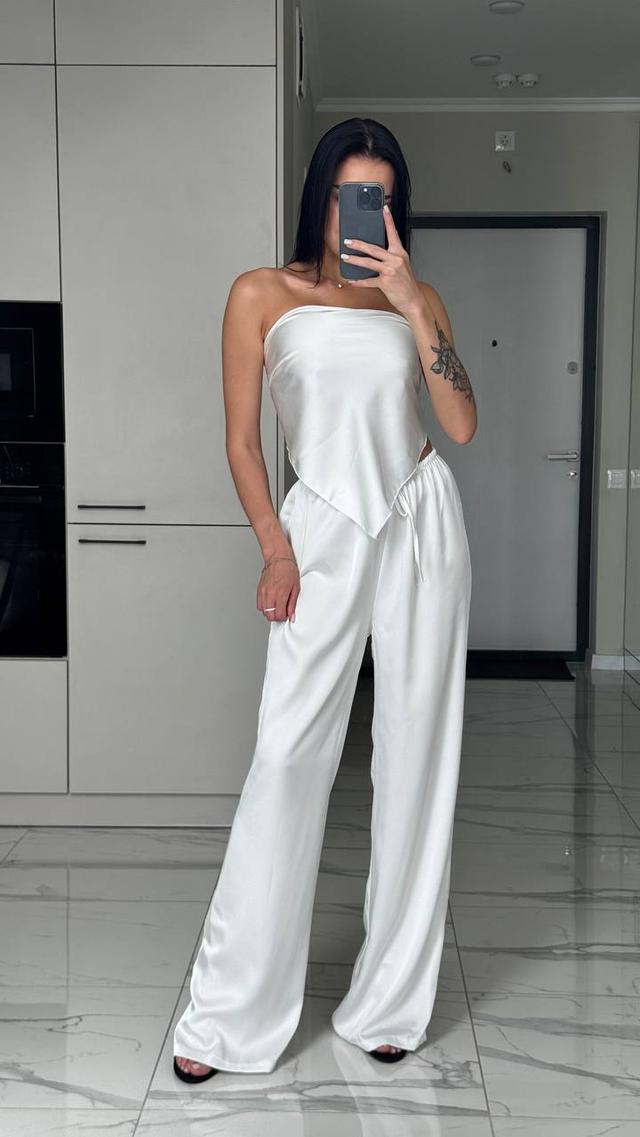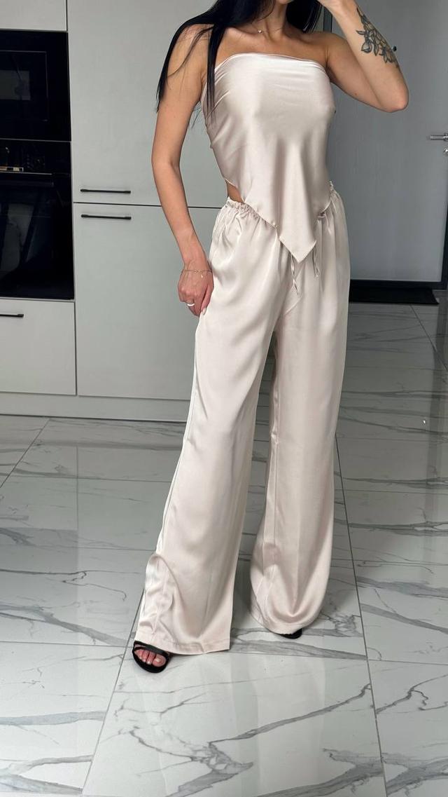 Легкі сатинові костюми з топом-бандо та широкими брюками – стильна база для будь-якого виходу. Вибирай серед ніжного шампанського, глибокого шоколаду, класичного чорного чи молочного відтінку.